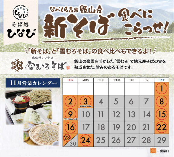 そば処「ひなび」11月のお知らせ 2025.10.31| お知らせ 11月そば処「ひなび」のお知らせ 日程:1日・2日、3日・8日、9日、 15日・16日、22日・23日、24日 営業時間:11:00~14:00(ラストオーダー13:40) 場所: 寺町公園ふれあい館(高橋まゆみ人形館隣接) 長野県飯山市大字飯山2941-1 地図詳細はコチラ お問い合わせ: 090-5774-8433 清水 投稿ナビゲーション 前の記事 Previous post:そば処ひなび 4月のお知らせ